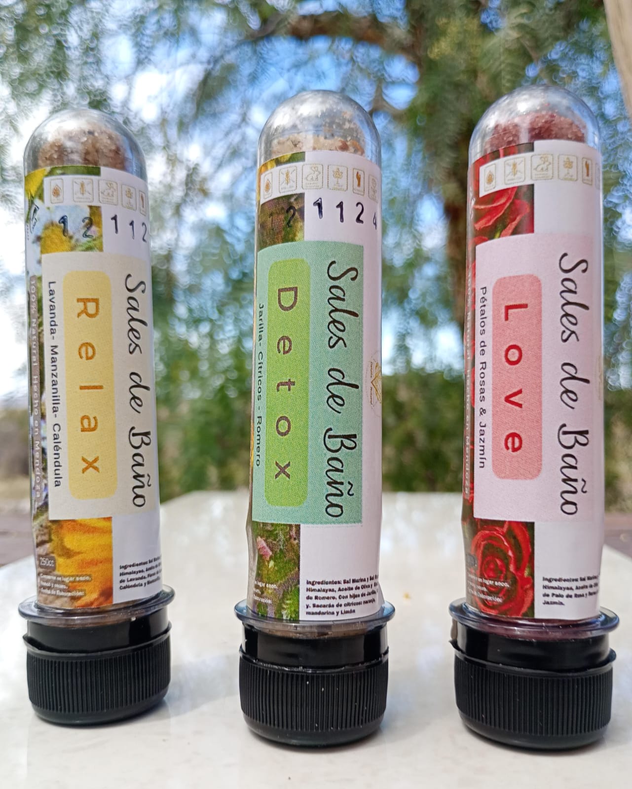 Estas sales de baño son ideales para añadirlas al agua caliente de tu bañera y tomar un baño que te permita relajar tu cuerpo y la mente, desconectando así de las frenéticas rutinas diarias, aliviando la tensión y fatiga acumulada. ¿Cómo usar sales de baño si no tengo bañera? Tomar un baño es solo un ejemplo de cómo usar las sales de baño. Si en casa no tienes bañera puedes disfrutar igualmente de los beneficios de los beneficios que te brindan. Elige entre estas opciones: Pediluvio relajante: no es lo mismo que un baño de cuerpo entero, pero con la justa atmósfera, un poco de música relajante y sentado en un sofá cómodo el alivio que del agua caliente con sales en los pies te regalará un buen rato de desconexión y bienestar. Exfoliación: Toma una porción de sal y mézclala con aceite de almendra, oliva o coco para frotarlo en tu cuerpo para una hacerte una exfoliación bajo la ducha. Es una forma natural y agradable de cuidarte y tomar un respiro del ritmo intenso del día a día. DETOX: Sales del Himalaya y Marina con aceite de Romero y Jarilla macerado en Oliva, aromatizadas con cáscaras de naranja, mandarinas y limón con Jarilla. Tamaño 100CC
